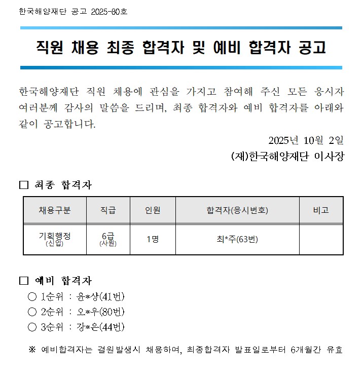직원 채용 최종 합격자 및 예비 합격자 공고