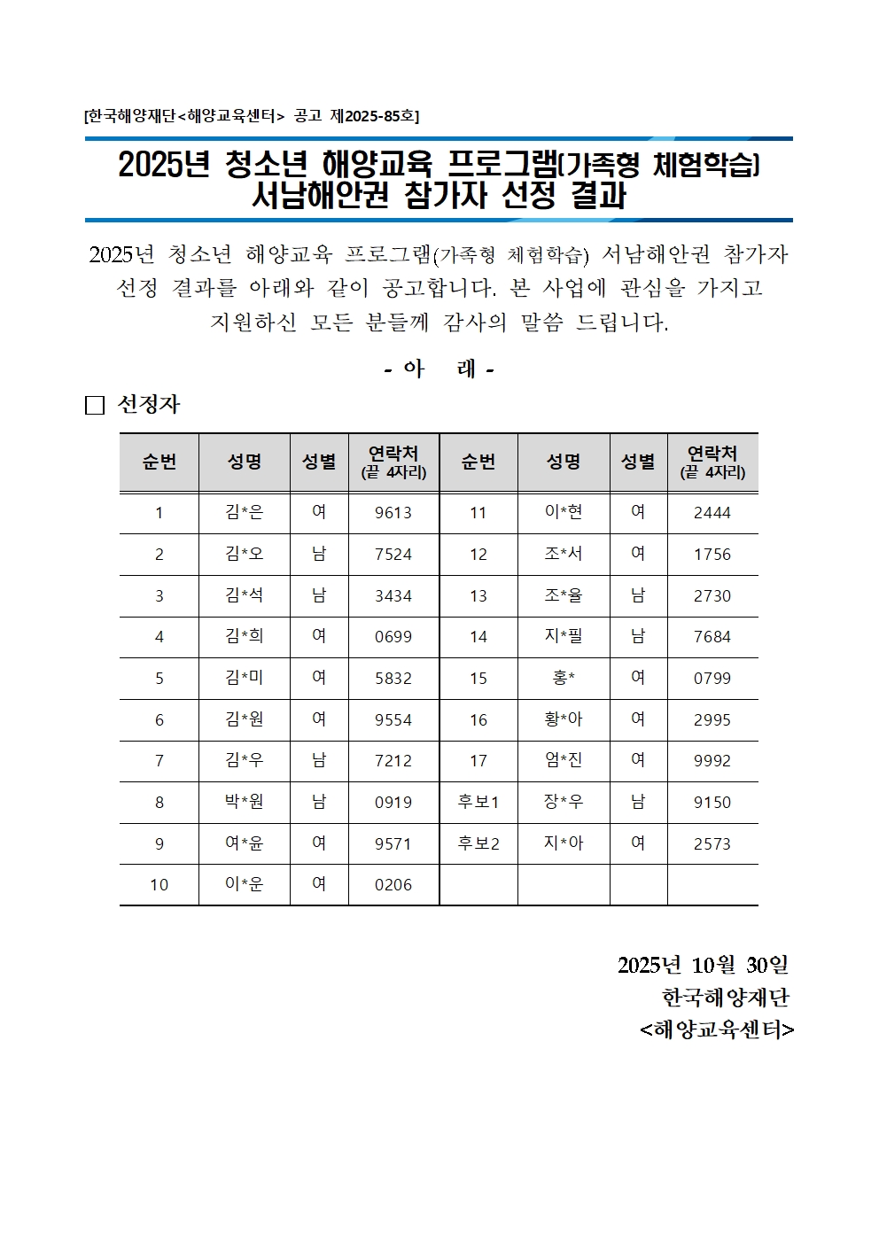 2025년 청소년 해양교육 프로그램(가족형 체험학습) 서남해안권 참가자 선정 결과 공고