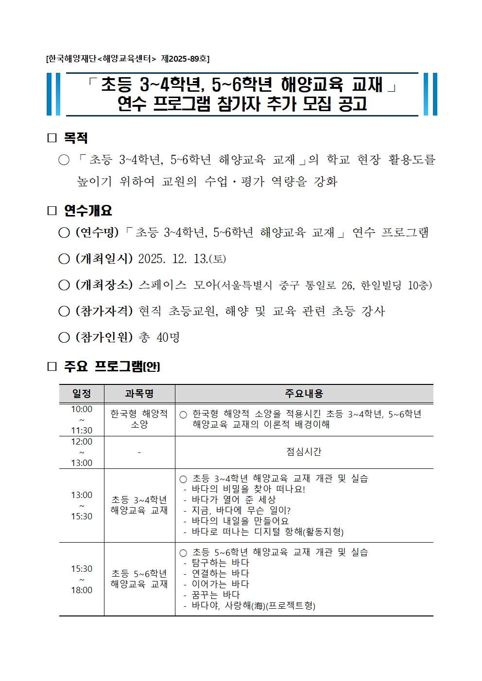 ⌜초등 3~4학년, 5~6학년 해양교육 교재⌟ 연수 프로그램 참가자 추가 모집 공고
