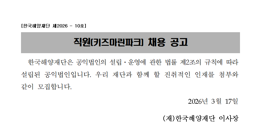 직원(키즈마린파크) 채용 공고(~3.30.(월))