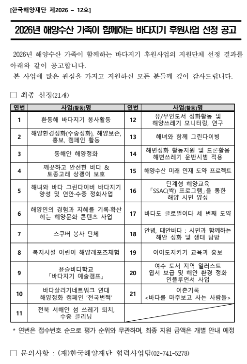 2026년 해양수산 가족이 함께하는 바다지기 후원사업 선정결과 공고