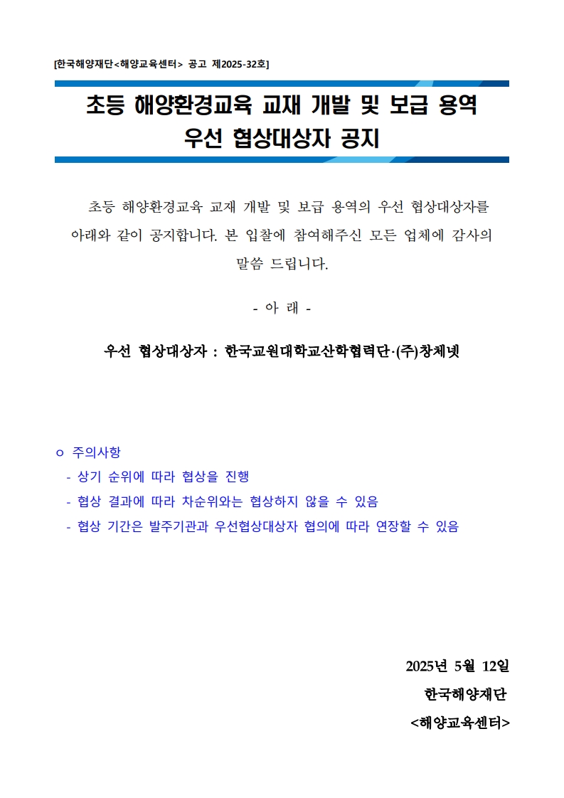 초등 해양환경교육 교재 개발 및 보급 용역 우선 협상대상자 공지