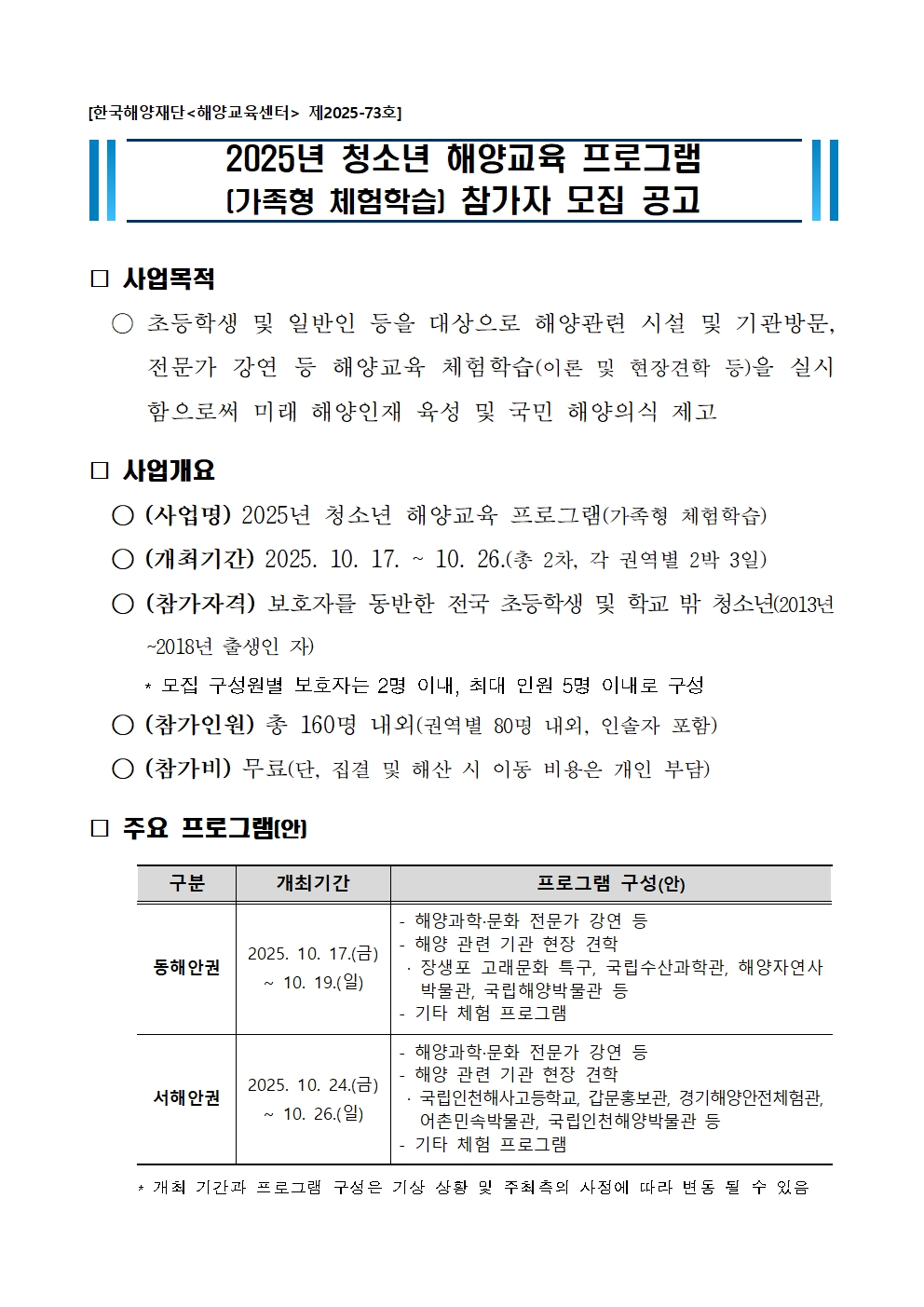 2025년 청소년 해양교육 프로그램(가족형 체험학습) 참가자 모집(~ 9. 17. 17:00)