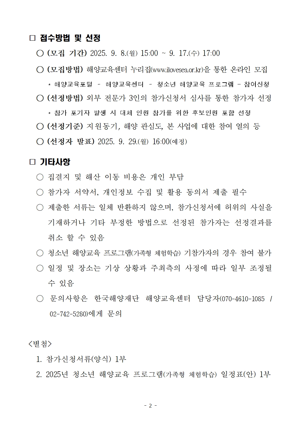 문의사항 : 070-4610-1085(해양교육센터 교육팀, 청소년 해양교육 프로그램 담당자)