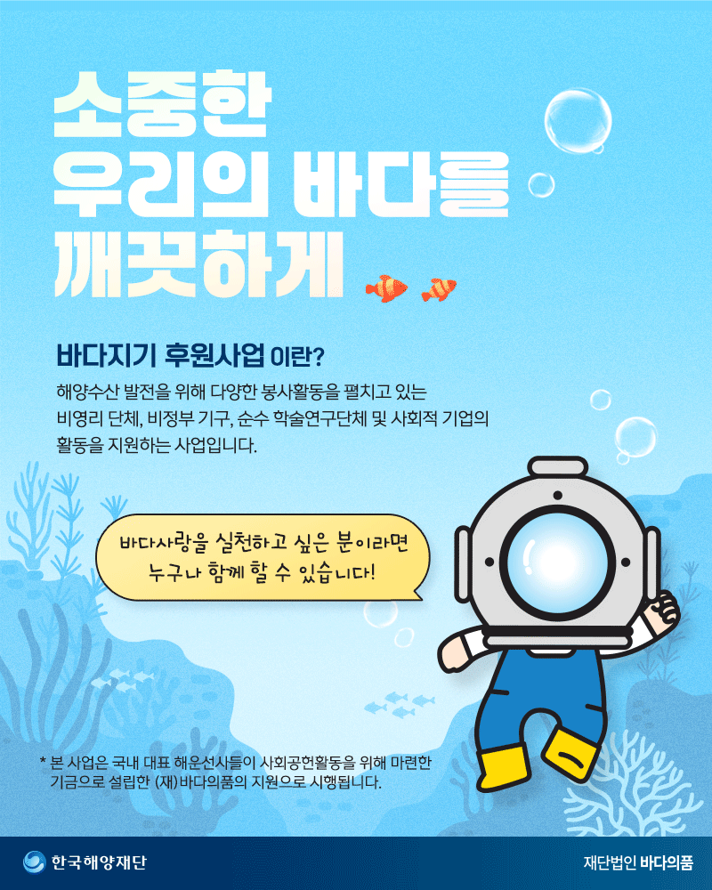 - 바다지기는 「바다지기 후원사업」을 통해 지원받고 있는 해양수산 관련 비영리 민간단체, 봉사단체 등입니다.