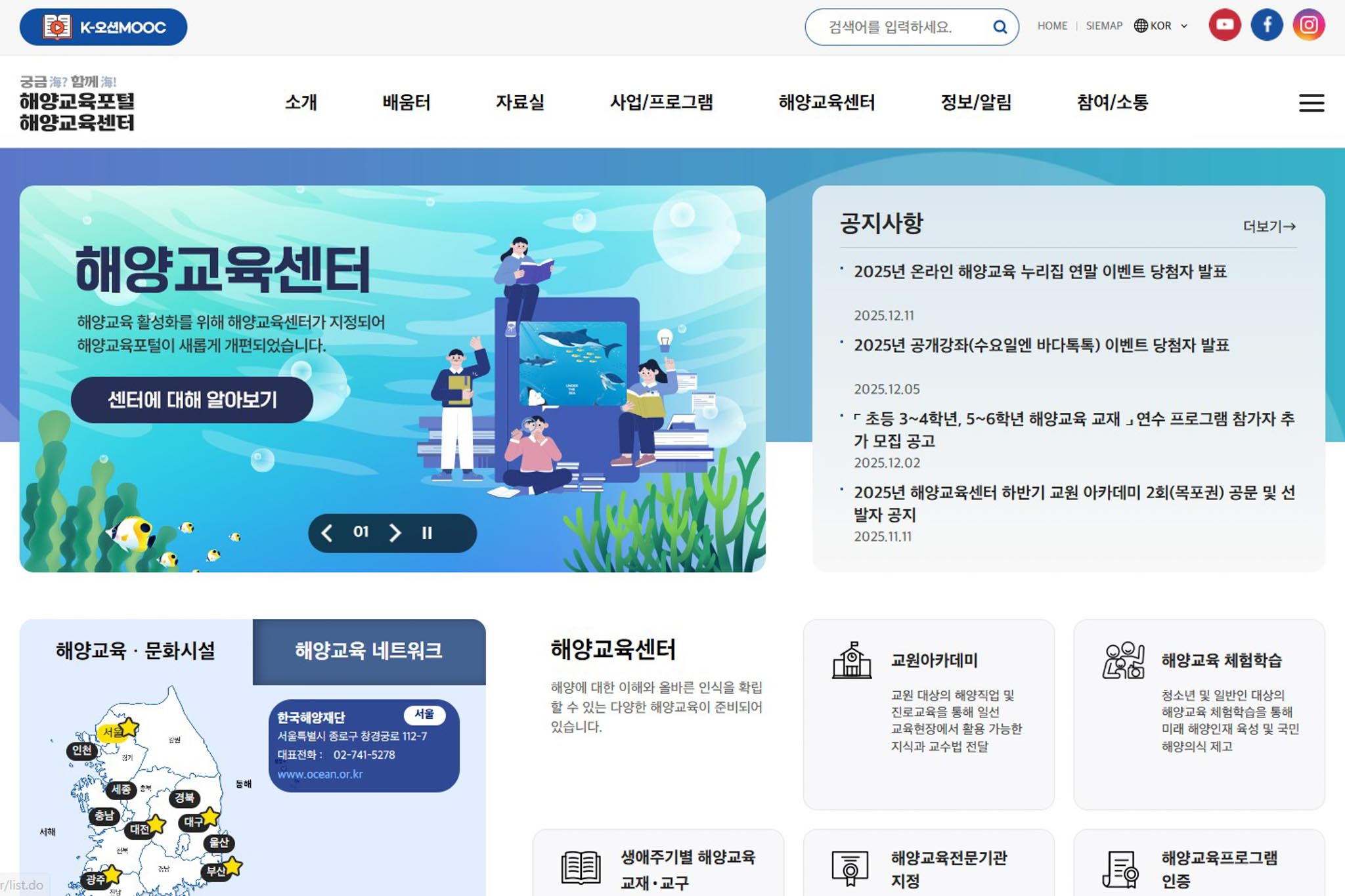 - 해양교육포털 : 해양분야별 교육정보 및 자료 제공, 해양교육 관련 사업 및 각종 프로그램 안내